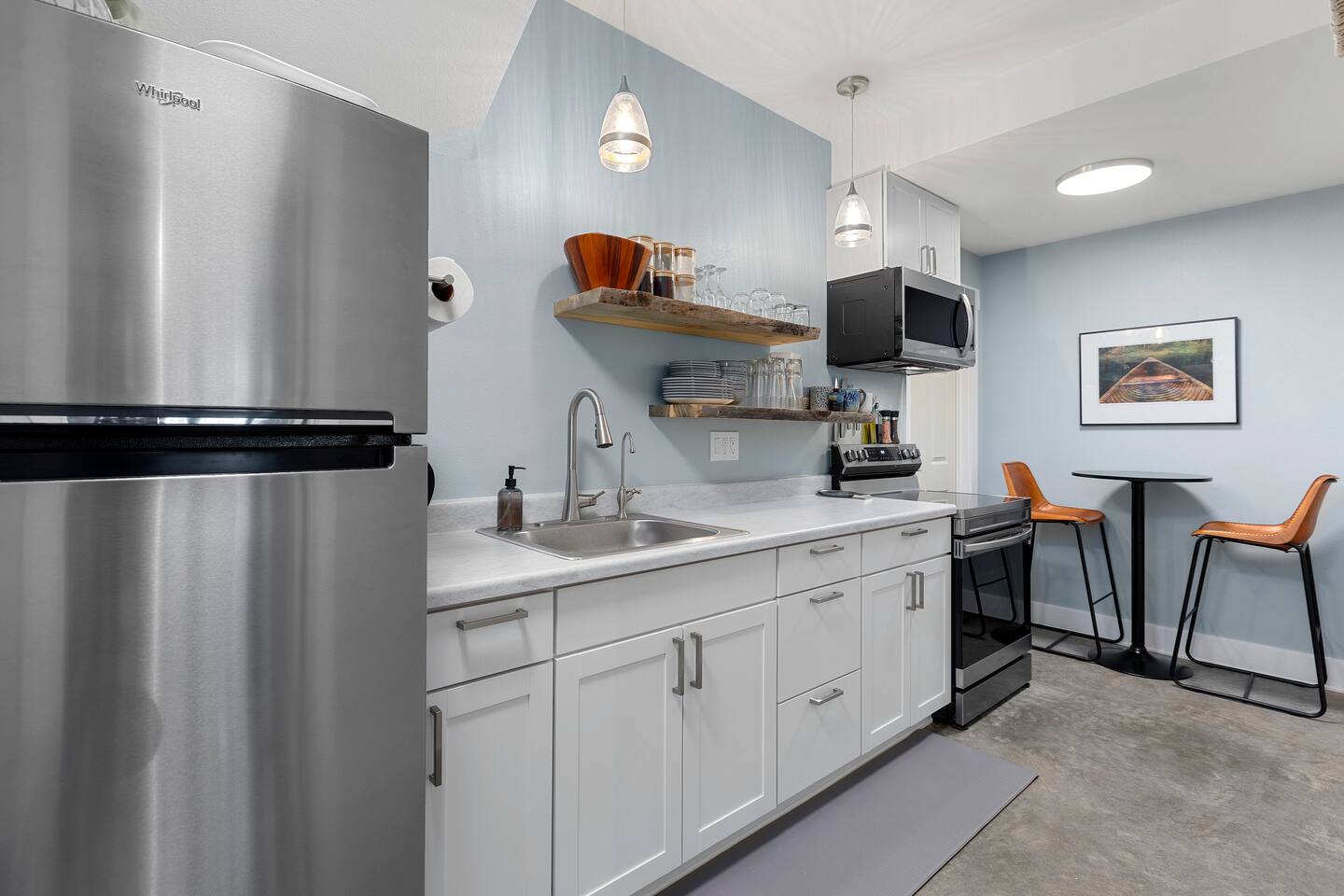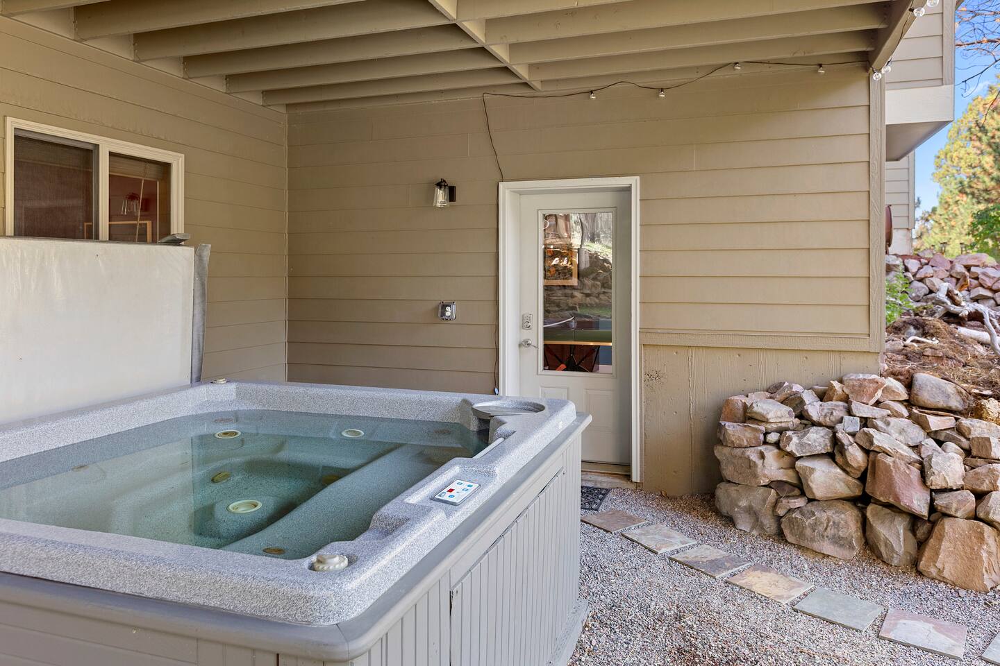 This is the entire 2k s.f. lower level of my home with a private entrance and relaxing hot tub. It feels like you’re in the mountains yet it's only a 10 min drive from downtown. Pine trees surround the 1 acre property and you can hear the creek running through the backyard. Enjoy sitting around the fire pit, playing ping pong, or cozy up watching a movie.